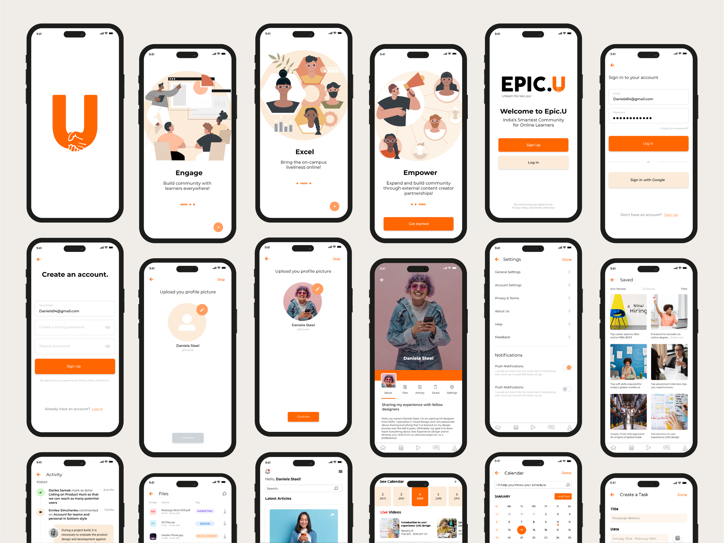 While working as Design Manager at UNext, I led the brand and UX design for Epic.U — a social learning platform built to bring the energy of campus life into online education. The platform was designed to help students connect, find their community, attend events, and collaborate — bridging the gap between digital accessibility and the human experience of being a student.