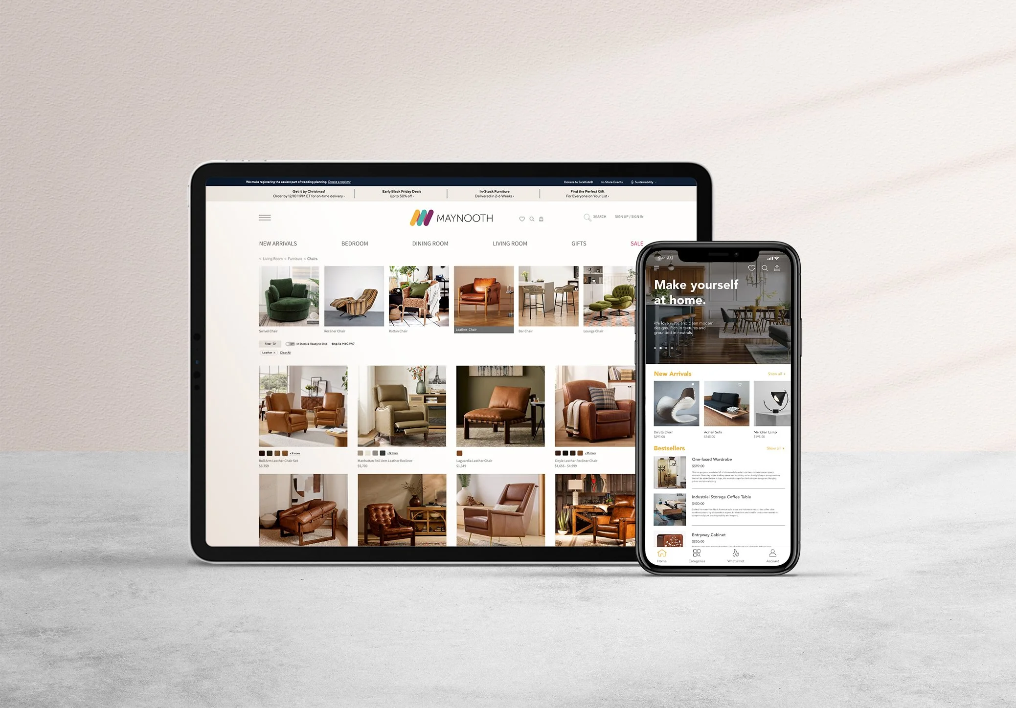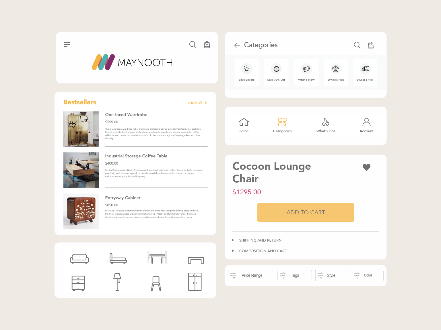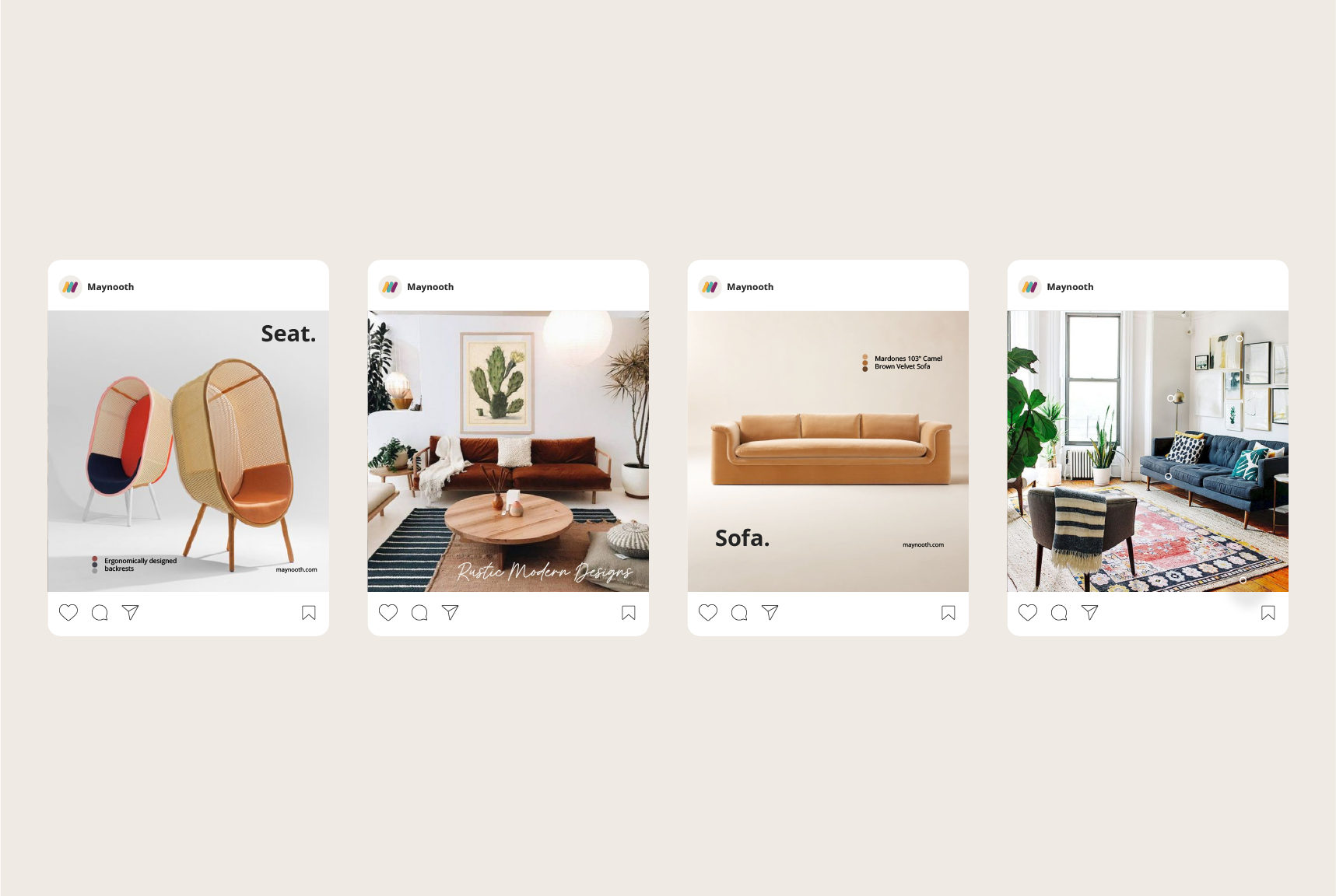 Maynooth is mid-tier furniture brand which runs a thriving retail operation of contemporary and modern home furniture. Heavily inspired by mid century modern furniture styles the idea was to create a visual identity that accentuates the brand products. The brief was to create a visual identity and digital experience that elevated the brand — making it feel as considered and refined as the furniture it sells.