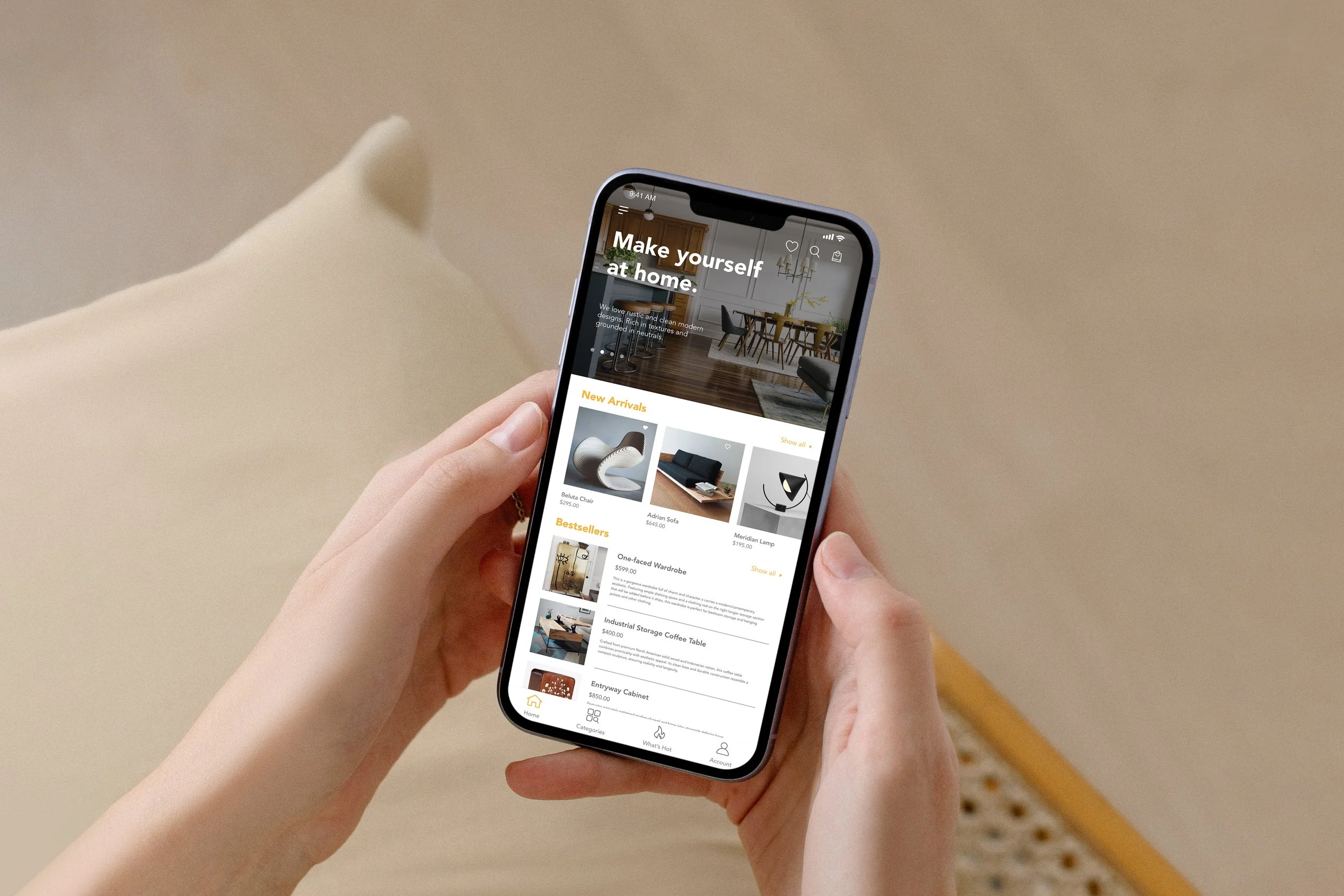 My approach to the brand identity takes cues from the Scandinavian-esque design style to enhance the minimal look and feel. Mid-century modern is a well-loved aesthetic, which means there's a risk of the brand feeling derivative rather than authoritative. The identity is minimal without being cold: clean typography, a restrained colour palette, and a visual rhythm that mirrors the proportions and negative space of well-designed furniture. The UI design extends this logic into the digital experience — every screen is an exercise in clarity, making it easy for customers to fall in love with the products rather than wrestle with the interface.