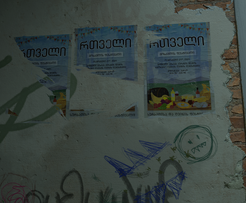 The brief was to create an entire ecosystem of in-game visual assets — advertisement posters, graffiti art, stationery, logo systems for fictional companies, and custom typefaces — all of which needed to feel like they belonged in a real, lived-in world rather than a designed one. The challenge was balance. Splinter Cell has a specific visual identity — gritty, cinematic, technically precise — and the in-game graphics needed to honour that while also feeling contemporary. I referenced the original game extensively, cross-referencing source material with internal resources to make sure every asset respected the franchise's legacy while meeting the quality bar of a modern AAA release. Working closely with the Narrative team was essential — every visual decision had to serve the story. A poster in the background of a scene isn't just decoration; it's worldbuilding. That level of intentionality is something I carry into every project.